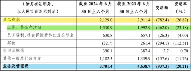 据梳理,2024年上半年,渝农商行业务及管理费37.01亿元,同比减少9.37亿元,降幅20.21%。其中,其他一般及行政开支11.82 亿元,同比减少1.58亿元,降幅11.76%。另外,员工成本21.29亿元,同比减少7.82亿元,大幅下降26.87%。具体来看:其中,工资、奖金和津贴15.31亿元,减少4.62亿元,降幅23.18%;员工福利、社会保险费和住房公积金6.31亿元,减少0.26亿元,降幅4%。