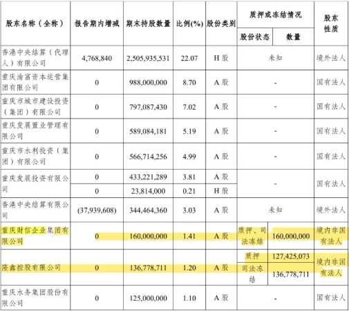 此外,渝农商行股东质量有待优化。报告期末,渝农商行第八大股东重庆财信企业集团有限公司持有该行股份1.6亿股,持股比例1.41%,这些股份遭全盘质押及司法冻结;第九大股东隆鑫控股有限公司持有1.37亿股,持股占比1.2%,这些股份亦悉数被司法冻结,其中超90%被质押。