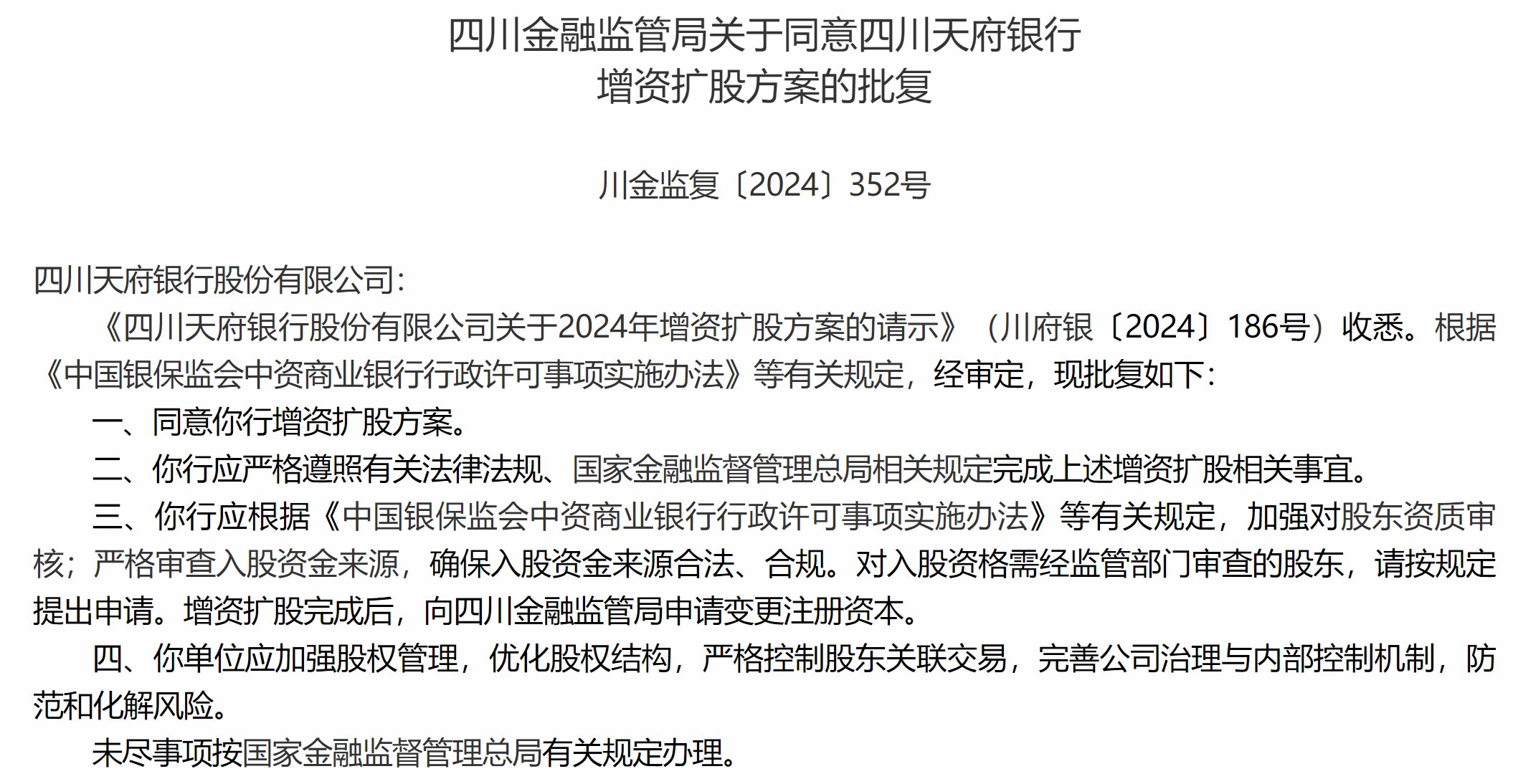 近日,据国家金融监管总局消息,天府银行2024年增资扩股方案获四川金融监管局批复同意。