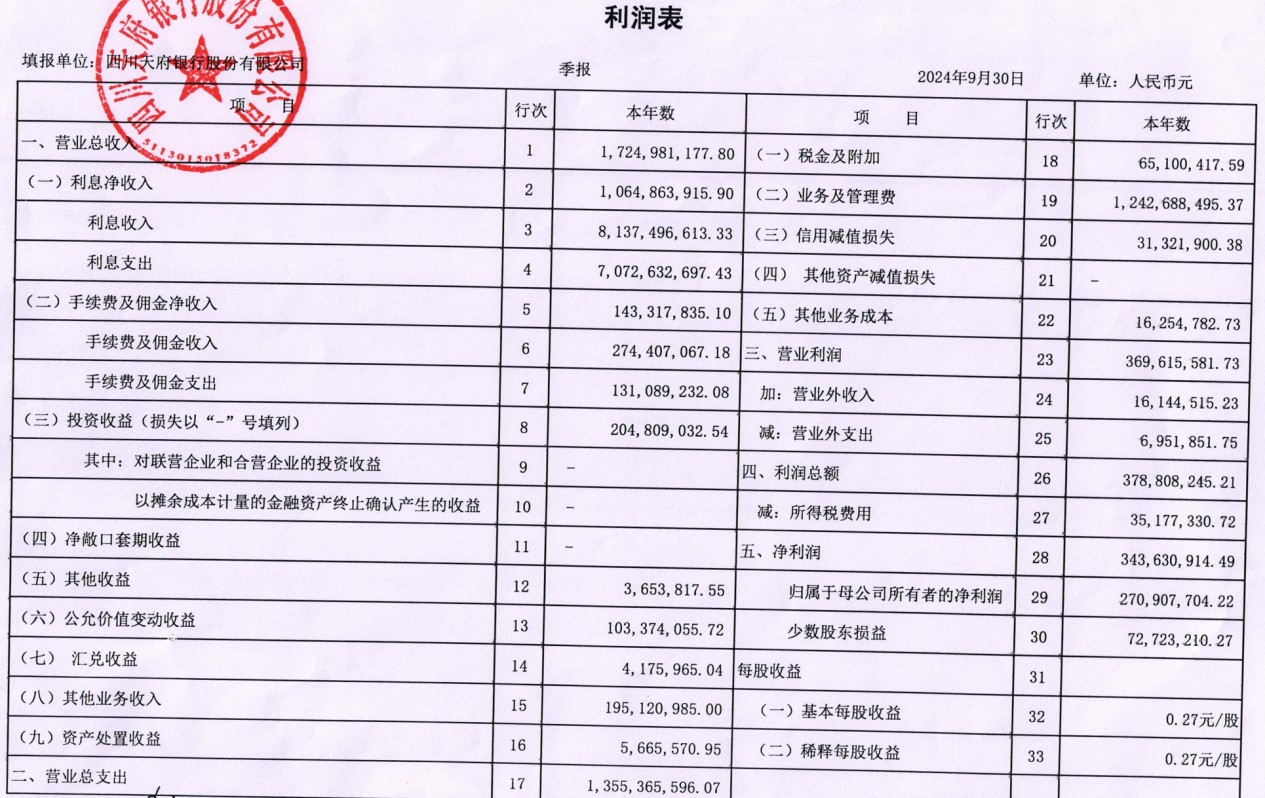 2024年前三季度,天府银行的营收继续下降,由上年同期的18.10亿元下降至17.25亿元;净利润亦出现下滑,由上年同期的3.80亿元下滑至3.44亿元。