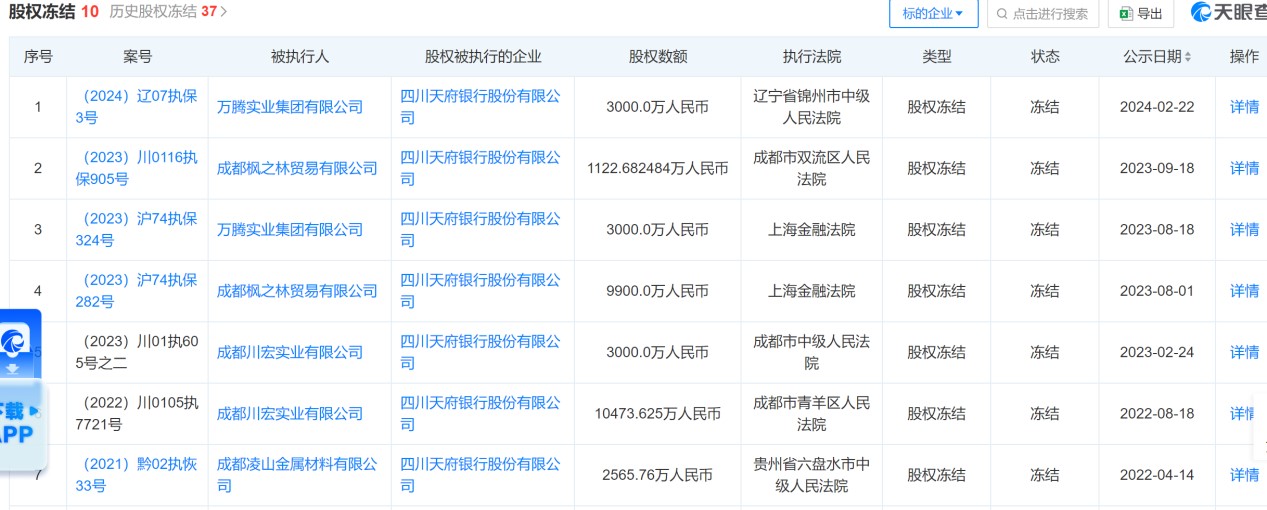 天眼查显示:截止11月20日,天府银行作为标的企业涉及的股权冻结信息共有10条。其中,成都枫之林贸易有限公司(下称“成都枫之林”)所持天府银行两笔被冻结股权数额分别是9900万元、约1122.68万元。