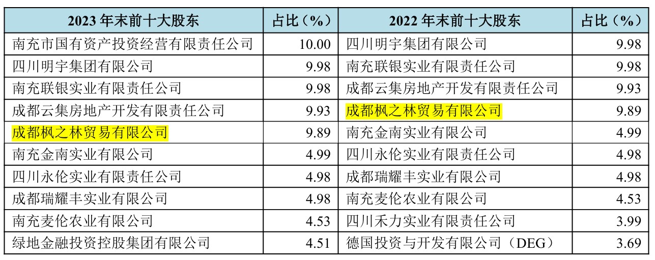 据天府银行2023年度报告摘要披露,截至2023年末,成都枫之林持有天府银行股份占比9.89%,位居第五大股东。目前,因未按执行通知书指定的期间履行生效法律文书确定的给付义务,该公司已被下发5条限制消费令。另外,天眼查显示:天府银行前十大股东中包括房企及经营范围涵盖房地产开发与经营的公司,分别是第四大股东成都云集房地产开发有限责任公司、第五大股东成都枫之林、第六大股东南充金南实业有限公司。
