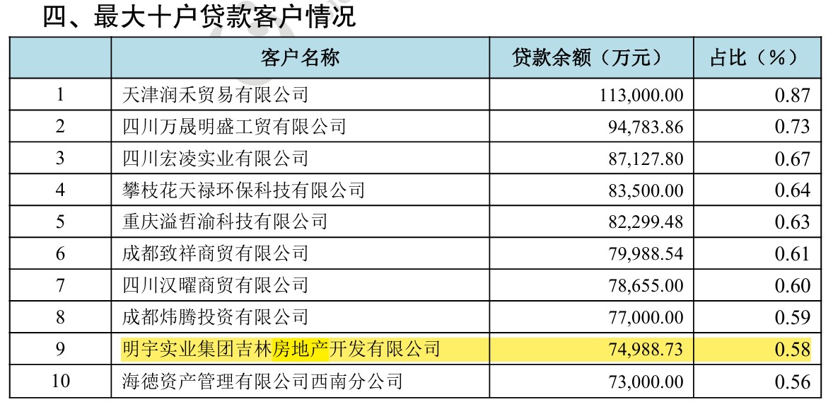 上述三家公司在天府银行的贷款余额分别约7.50亿元、7.70亿元、11.30亿元,占比分别为0.58%、0.59%、0.87%。