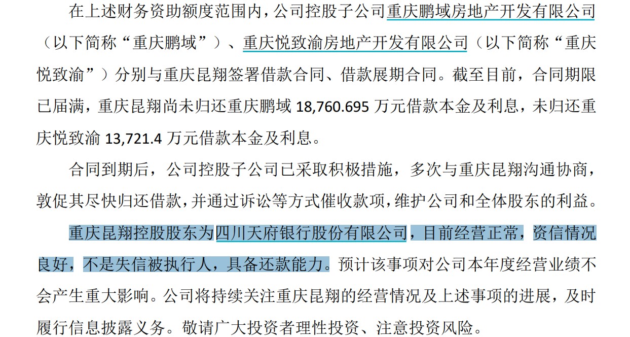 大悦城表示,已通过诉讼等方式催收款项。公告还提到,“重庆昆翔控股股东为四川天府银行股份有限公司,目前经营正常,资信情况良好,不是失信被执行人,具备还款能力。”