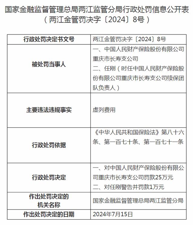 台海网7月23日讯 根据国家金融监督管理总局网站近日发布的行政处罚信息公开表(两江金管罚决字〔2024〕8号)显示,因虚列费用,国家金融监督管理总局两江监管分局对中国人民财产保险股份有限公司重庆市长寿支公司罚款25万元;对任刚(时任中国人民财产保险股份有限公司重庆市长寿支公司续保团队负责人)警告并罚款1万元。