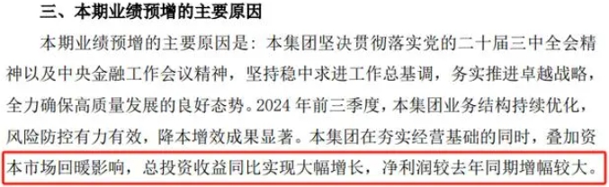 在解释公司三季报业绩预增的原因时,中国人保称,集团在夯实经营基础的同时,叠加资本市场回暖影响,总投资收益同比实现大幅增长,净利润较去年同期增幅较大。