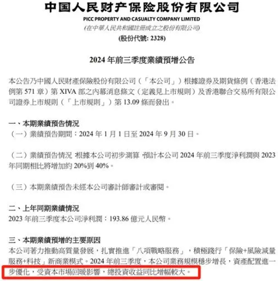 同日晚间,中国财险在港交所发布公告,根据公司初步测算,预计公司2024年前三季度净利润与2023年同期相比将增加约20%到40%。