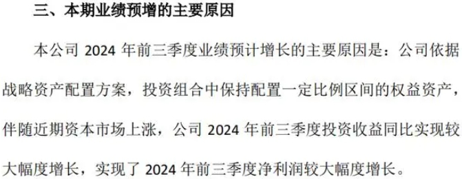 在解释公司三季报业绩预增的原因时,中国太保称,公司依据战略资产配置方案,投资组合中保持配置一定比例区间的权益资产,伴随近期资本市场上涨,公司2024年前三季度投资收益同比实现较大幅度增长,实现了2024年前三季度净利润较大幅度增长。(财联社 陆清濂)