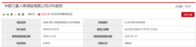 蓝鲸新闻12月16日讯(记者 石雨)今日,北京产权交易所正式披露中银三星人寿保险有限公司(下称“中银三星人寿”)24%股权的转让信息。该笔股权由中国航空集团有限公司(下称“中航集团”)持有,转让底价设定为181462.9万元,信息披露结束日期至2025年1月13日。