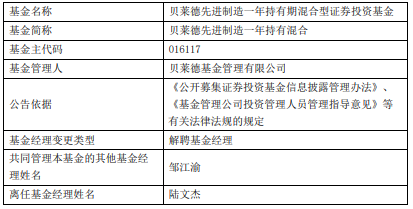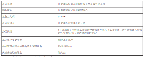 中国经济网北京7月31日讯 今日,贝莱德基金管理有限公司公告,陆文杰离任贝莱德先进制造一年持有混合、贝莱德港股通远景视野混合。