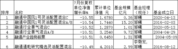 融通基金邹曦管理6只基金7月份跌约10.5%