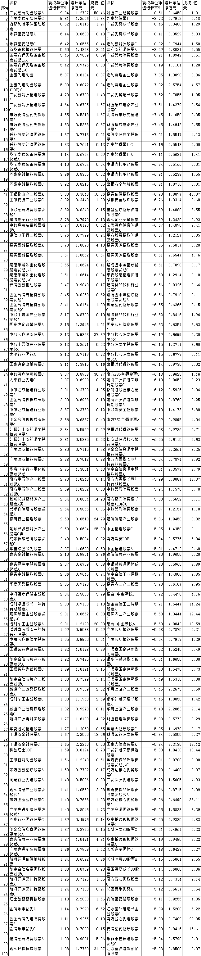 2024年7月份普通股票型基金涨跌幅前100名