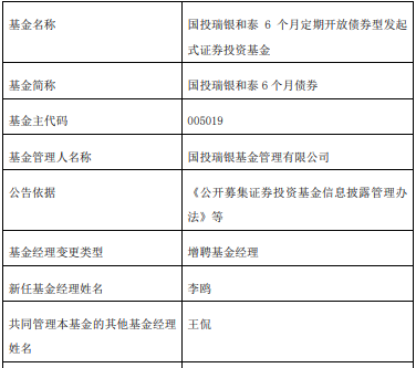 国投瑞银和泰6个月债券增聘基金经理李鸥