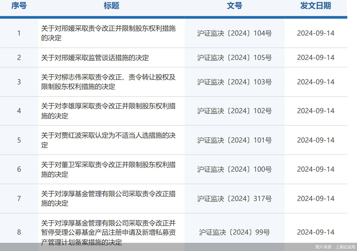 回顾9月14日,上海证监局下发8张监管函,直指淳厚基金未依法履行股权事务管理义务等相关情况。虽然8张监管函集中在同一日披露,但落款时间并不相同,其中,7张监管函于今年3月18日下发。
