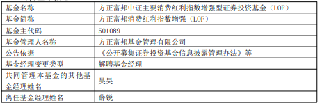 中国经济网北京10月9日讯 今日,方正富邦基金管理有限公司公告,薛锐离任方正富邦消费红利指数增强(LOF),吴昊管理。