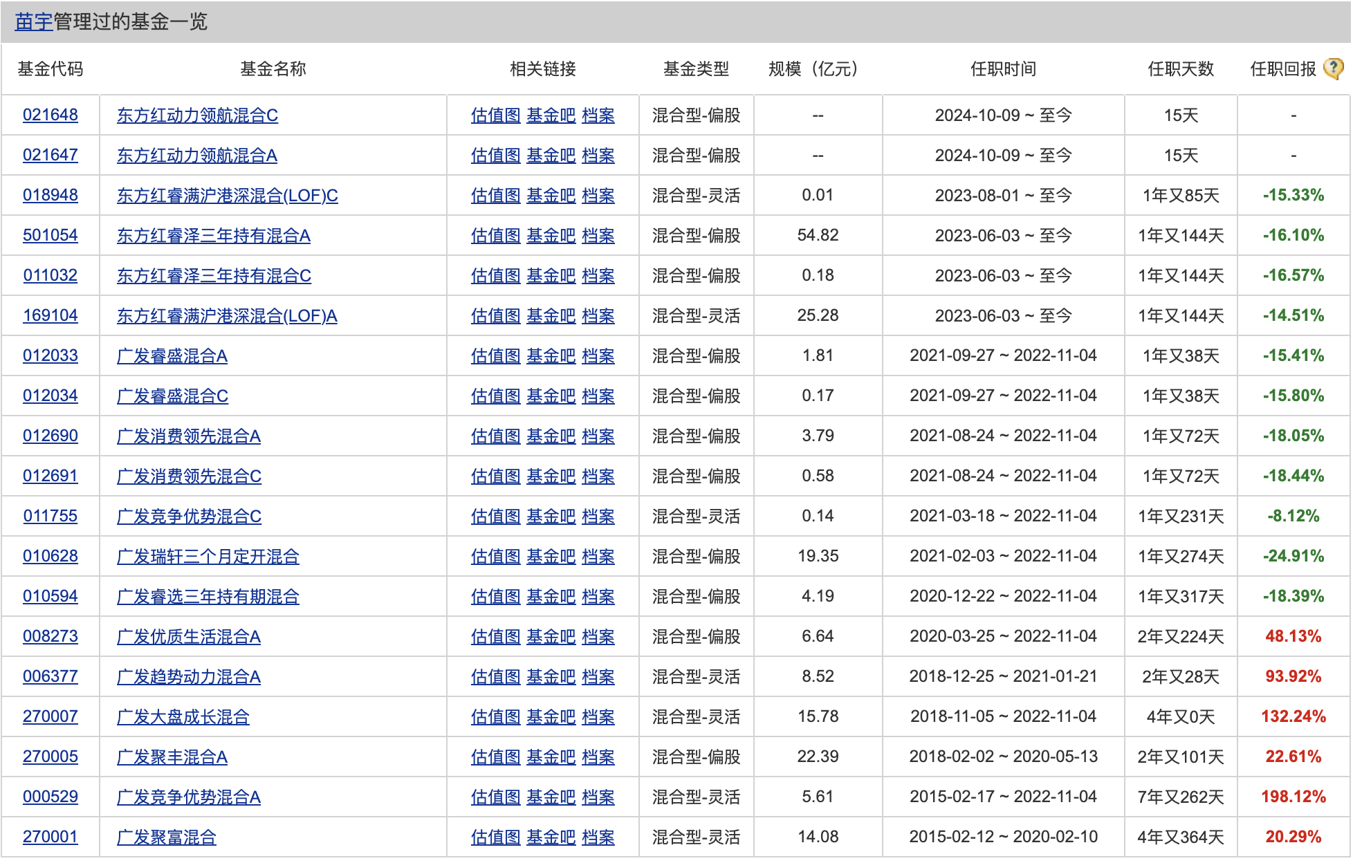 天天基金网显示,苗宇2022年11月卸任产品中,除了广发优质生活混合A,其余多只产品的任职回报均为负值,亏损均在15%上下,但这些产品多成立于市场处于相对高点的2020年年末或2021年。
