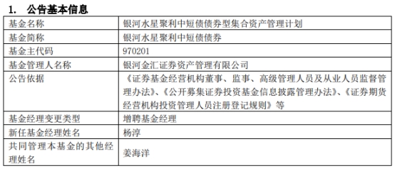 银河水星聚利中短债债券增聘基金经理杨淳