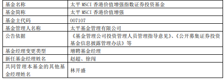 中国经济网北京11月15日讯 今日,太平基金管理有限公司公告,太平MSCI香港价值增强新任基金经理赵超、徐闯。