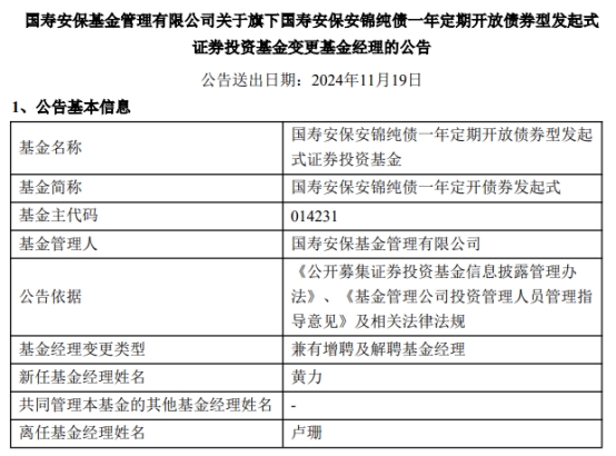 国寿安保安锦纯债一年定开增聘基金经理黄力 卢珊离任