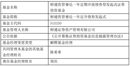 中国经济网北京12月2日讯 近日,财通证券资产管理有限公司公告,周庆离任财通资管睿达一年定开债券发起式,陈希希管理。