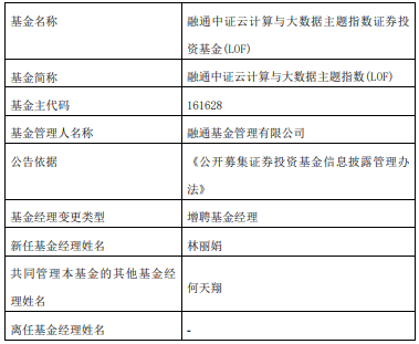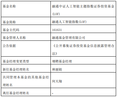 中国经济网北京12月17日讯 今日,融通基金管理有限公司公告,融通人工智能指数(LOF)、融通中证云计算与大数据主题指数(LOF)增聘基金经理林丽娟。