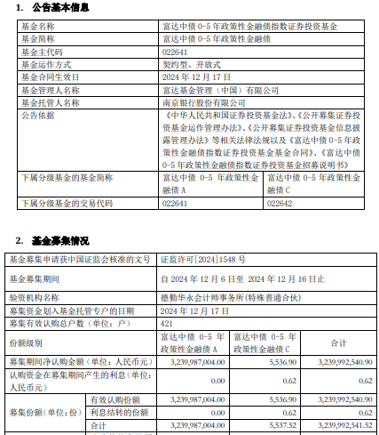 募集期间净认购金额3,239,992,540.90元,认购资金在募集期间产生的利息0.62元,募集份额合计3,239,992,541.52份。
