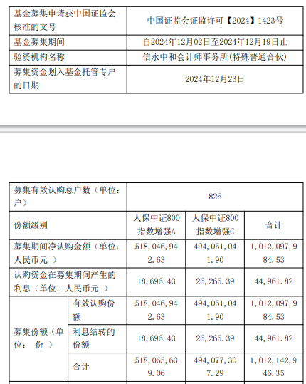 募集期间净认购金额1,012,097,984.53元,认购资金在募集期间产生的利息44,961.82元,募集份额合计1,012,142,946.35份。