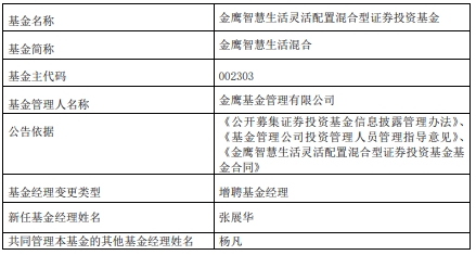 中国经济网北京1月13日讯 近日,金鹰基金管理有限公司公告,金鹰智慧生活灵活配置混合增聘张展华。