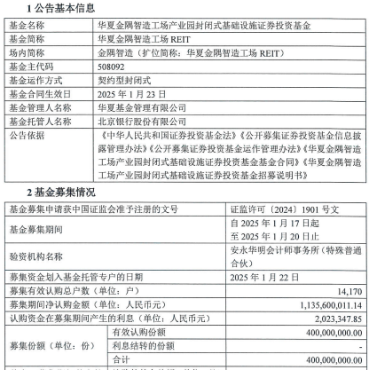 华夏金隅智造工场REIT成立 规模11.38亿元