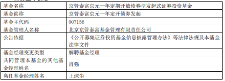 中国经济网北京2月7日讯 今日,北京京管泰富基金管理有限责任公司公告,王沫尘离任京管泰富京元一年定期开放债券。