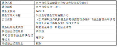 兴全合宜混合(LOF)增聘薛怡然 程剑离任