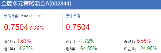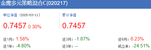 数据显示,金鹰多元策略混合A成立于2016年8月9日,截至2025年3月11日,其近3年和近2年的收益率分别为-64.55%、-52.71%,累计净值仅有0.7504元,累计收益率为-24.96%。而金鹰多元策略混合C成立于2023年12月1日,至今仅有1年多时间,但累计收益率也同样下跌了24.51%,累计净值为0.7457元。