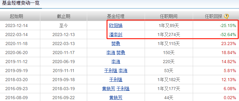 从2024年各季度的前十大重仓股看,其在一季度时全部重仓医药股,包括荣昌生物、凯因科技、智翔金泰、迪哲医药、新诺威等,但到了二季度又全部变成了蓝筹股,包括贵州茅台、万华化学、长江电力、山西汾酒、中国平安、招商银行等,此后就一直保持该风格。而从基金经理的变更来看,金鹰多元策略混合也是遭遇了频繁更换基金经理的命运,仅从最近几年看,2022年3月14日至2023年12月13日由潘李剑管理,这也是亏损幅度最大的一个时期,跌幅高达52.64%,从2023年12月14日至今该基金变更为欧阳娟管理,也就是现任基金经理,但其管理了1年多后任职回报同样下跌了25.15%。