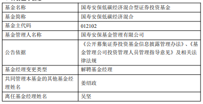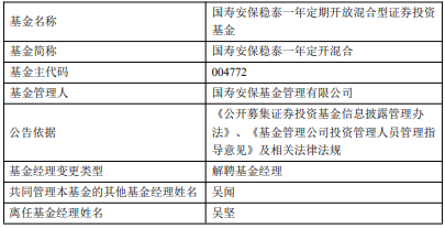 吴坚离任国寿安保稳泰一年定开国寿安保低碳经济混合