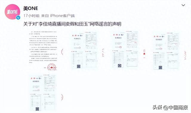 中国商报(记者 陈晴)7月17日,美腕官方微博发布关于对“李佳琦直播间卖假和田玉”网络谣言的声明。声明中称,产品上播前,公司对产品进行严格的选品和资质审核,确保产品合法合规。2023年10月,公司关注到部分自媒体发帖,即刻对所审资质进行了复审,并联系第三方权威检测机构进行送检,最终得出结论为上播产品符合国家标准。