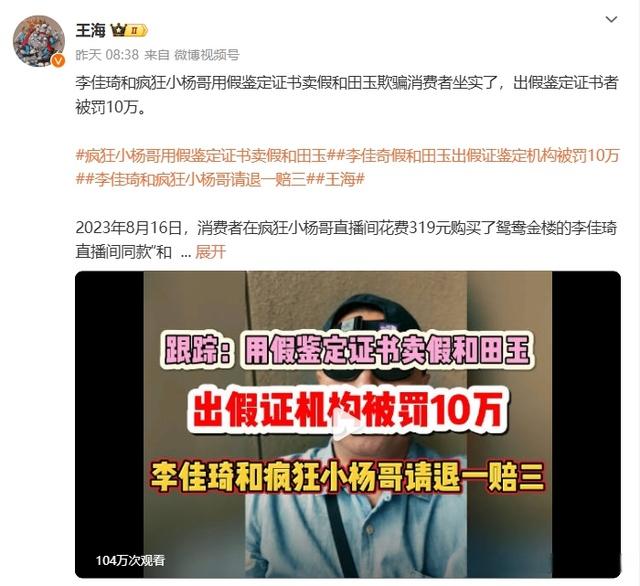此前,7月17日上午,打假人王海发文称,李佳琦和“疯狂小杨哥”用假鉴定证书卖假和田玉欺骗消费者坐实了,出假鉴定证书者被罚10万元。