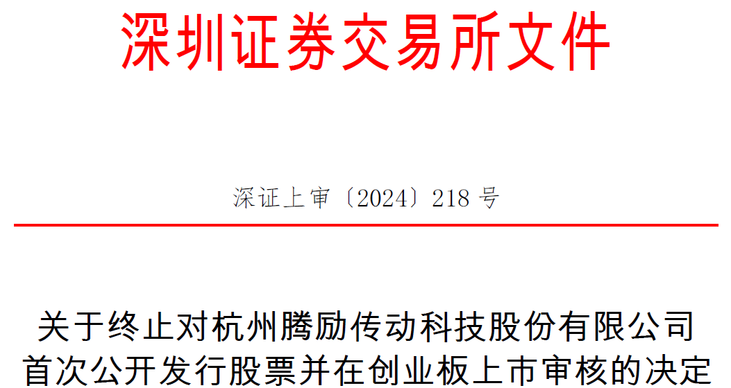 中国经济网北京7月21日讯 深交所网站昨日披露关于终止对杭州腾励传动科技股份有限公司(简称“腾励传动”)首次公开发行股票并在创业板上市审核的决定。