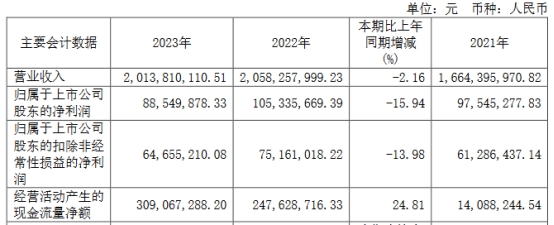 2023年年报显示,去年,公司实现营业收入20.14亿元,同比下降2.16%;归母净利润8854.99万元,同比下降15.94%;扣非净利润6465.52万元,同比下降13.98%;经营活动产生的现金流量净额为3.09亿元,同比增长24.81%。