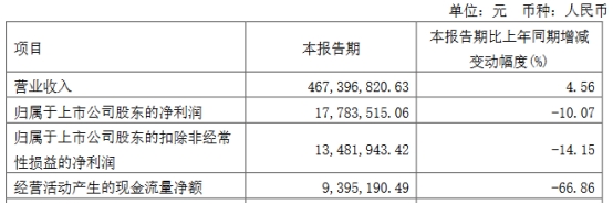 2024年第一季度,公司实现营业收入4.67亿元,同比增长4.56%;归母净利润1778.35万元,同比下降10.07%;扣非净利润1348.19万元,同比下降14.15%;经营活动产生的现金流量净额为939.52万元,同比下降66.86%。