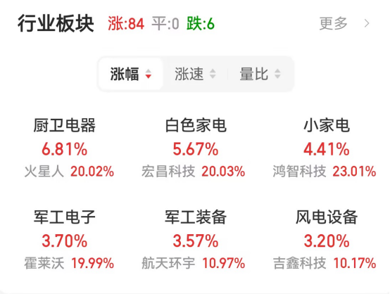 板块方面,厨卫电器、白色家电等涨幅靠前,银行、公路铁路运输等跌幅靠前。