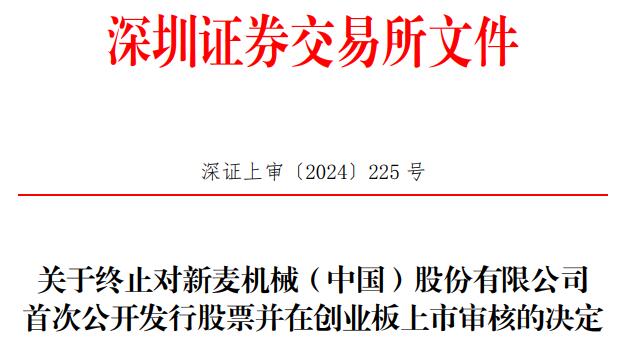 日前,新麦机械向深交所提交了《新麦机械(中国)股份有限公司关于撤回首次公开发行股票并在创业板上市申请文件的申请》,保荐人向深交所提交了《金圆统一证券有限公司关于撤回新麦机械(中国)股份有限公司首次公开发行股票并在创业板上市申请文件的申请》。根据《深圳证券交易所股票发行上市审核规则(2024年修订)》第六十二条的有关规定,深交所决定终止对新麦机械首次公开发行股票并在创业板上市的审核。