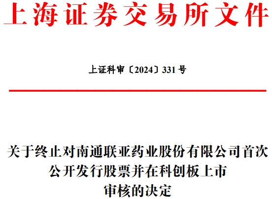 中国经济网北京9月29日讯 上交所网站近日发布关于终止对南通联亚药业股份有限公司(以下简称“联亚药业”)首次公开发行股票并在科创板上市审核的决定。