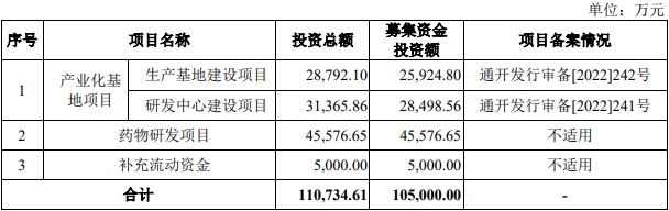 联亚药业原拟在上交所科创板公开发行股数不超过13,373.9563万股,不低于本次发行后总股本的10%(超额配售选择权行使前)。联亚药业原拟募集资金105,000.00万元,分别用于产业化基地项目、药物研发项目和补充流动资金。