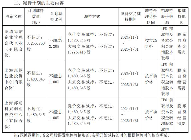 隽洁投资长期看好公司的发展,因自身资金需求,计划自公告披露之日起15个交易日后的3个月内(即2024年11月1日-2025年01月31日)以集中竞价交易或大宗交易方式减持其所持有的公司股份数量合计不超过3,256,760股,拟减持比例不超过公司总股本的2.20%。