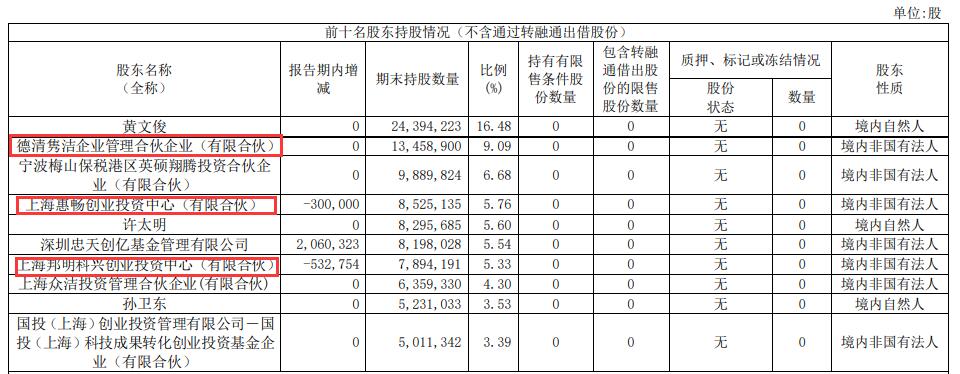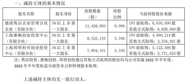 截至公告披露日,持股5%以上股东隽洁投资持有公司股份13,458,900股,占公司总股本的9.09%;持股5%以上股东惠畅创投持有公司股份8,525,135股,占公司总股本的5.76%;持股5%以上股东邦明创投持有公司股份7,894,191股,占公司总股本的5.33%。上述股东所持股份来源均为公司首次公开发行股票并在上海证券交易所科创板上市前取得的股份及通过公司2022年半年度、2023年半年度权益分派资本公积金转增股本取得的股份,且已于2021年8月17日起解除限售并上市流通。