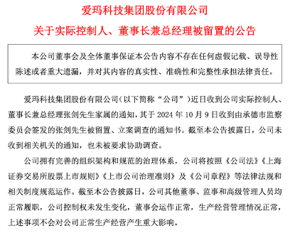 10月10日晚间,爱玛科技(603529.SH)公告,公司近日收到实际控制人、董事长兼总经理张剑家属的通知,其于10月9日收到由承德市监察委员会签发的张剑被留置、立案调查的通知书。截至公告披露日,公司未收到相关机关的通知,也未被要求协助调查。