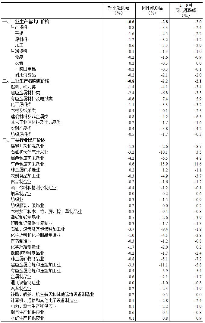 2024年9月份,全国工业生产者出厂价格同比下降2.8%,环比下降0.6%;工业生产者购进价格同比下降2.2%,环比下降0.8%。1—9月平均,工业生产者出厂价格比上年同期下降2.0%,工业生产者购进价格下降2.1%。