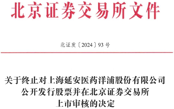2024年9月13日,延安医药向北交所提交了《上海延安医药洋浦股份有限公司关于撤回向不特定合格投资者公开发行股票并在北京证券交易所上市申请文件的申请报告》。根据《北京证券交易所向不特定合格投资者公开发行股票并上市审核规则》第五十五条的有关规定,北交所决定终止延安医药公开发行股票并在北京证券交易所上市的审核。