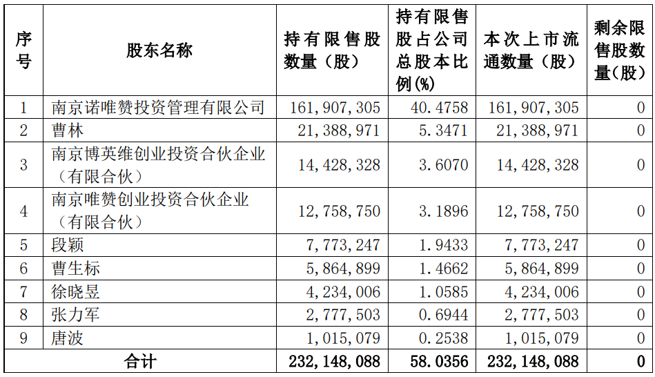 公告显示,根据中国证券监督管理委员会《关于同意南京诺唯赞生物科技股份有限公司首次公开发行股票注册的批复》(证监许可[2021]2367号),公司首次公开发行人民币普通股(A)股40,010,000股,并于2021年11月15日在上海证券交易所科创板挂牌上市。首次公开发行股票完成后,公司总股本为400,010,000股,其中有流通限制或限售安排的股票数量为366,958,566股,占公司发行后总股本的91.7373%,无流通限制及限售安排的股票数量为33,051,434股,占公司发行后总股本的8.2627%。本次上市流通的限售股为公司首次公开发行部分限售股,股票限售期限为自公司股票上市之日(2021年11月15日)起36个月。