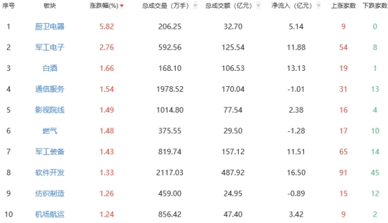 板块方面,厨卫电器、军工电子、白酒、通信服务等板块涨幅居前,种植业与林业、石油加工贸易、化学原料、农化制品等板块跌幅居前。
